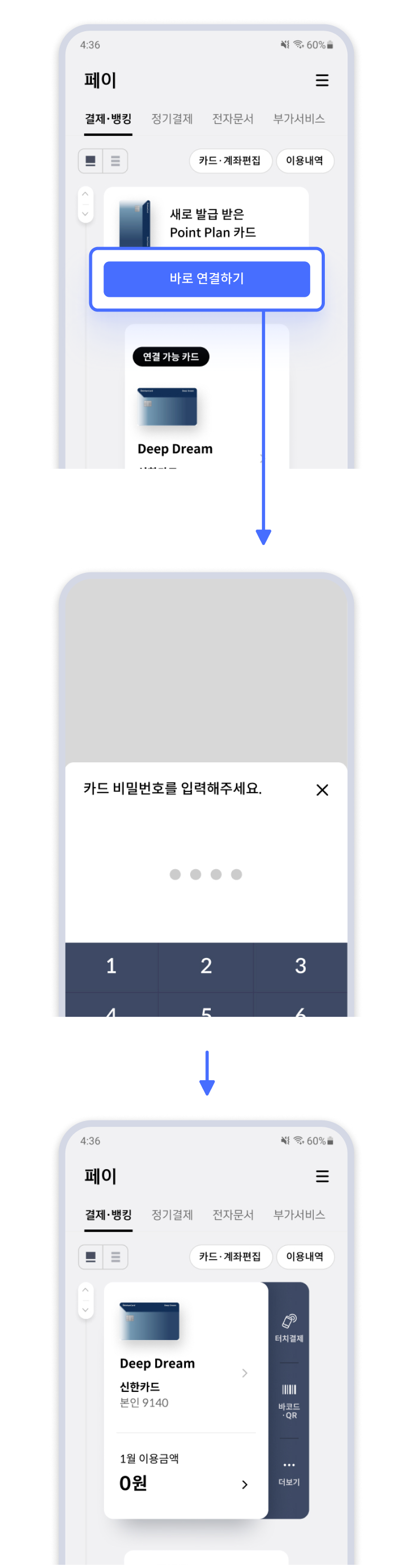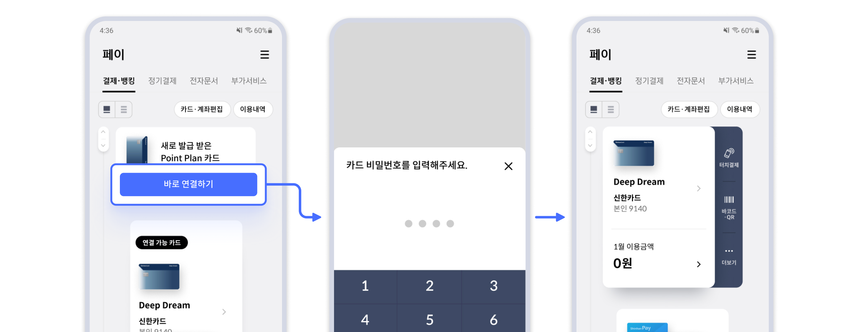 [쏠페이 > 페이 > 결제·뱅킹] 화면 상단에 발급 중인 카드 영역이 표시되며 [바로 연결하기]를 선택 하면 카드 비밀번호 입력 화면이 활성됨. 이 때 카드 비밀번호를 입력하면 설정이 완료되며 앱카드 사용이 가능함.